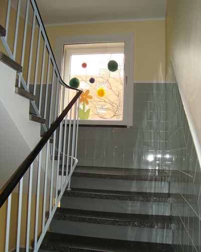 Das Treppenhaus im Haus der Familie sollte neu gestrichen werden. Bodenbeläge und der hellblaue