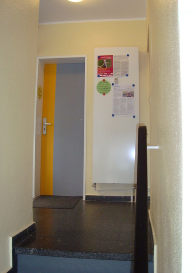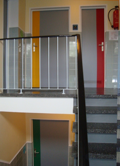 den Treppenraum. Die Farbstreifen der Türen geben einen Hinweis auf die Nutzung und sorgen für Abwechslung