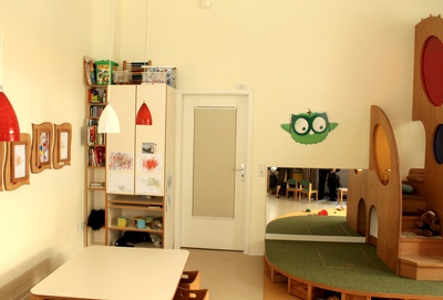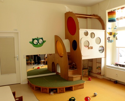 Der Aufenthaltsraum einer Kindertagespflege für Kinder bis zu 3 Jahren sollte eine zweite Ebene als Spiel-und Bewegungsfläche erhalten.