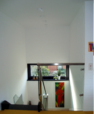 Die Treppe wirkt auch im Obergeschoss durch das neue Geländer filigraner, die neue Decke ist ruhiger, neue